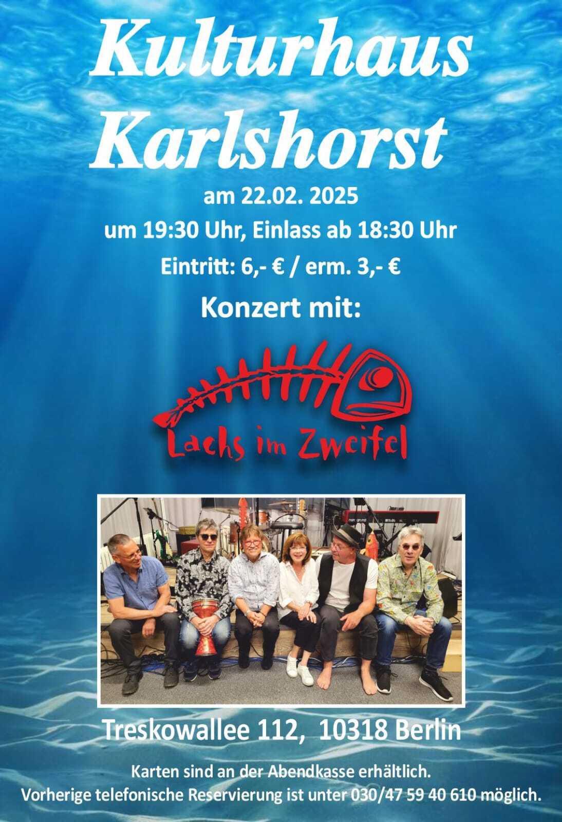 Lachs im Wandel der Zeiten Konzert im Restaurant Fischborke im Sommer 2024 Konzert im Kulturhaus Karlshorst am 22. Februar 2025