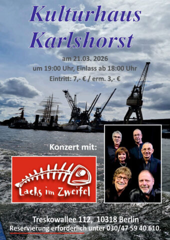 Kulturhaus Karlshorst Live 2026 Unsere Bewerbungsfotos für die Grammy Awards Unverständlich, warum die uns nicht genommen haben ??? Konzert im Kulturhaus Karlshorst 2025 Konzert im Restaurant Fischborke im Sommer 2024 Lachs im Wandel der Zeiten